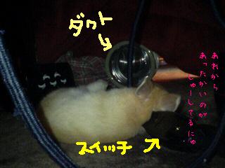 ダクトのまん前で、使われることのないこたつのスイッチを枕にゆったりのご様子。